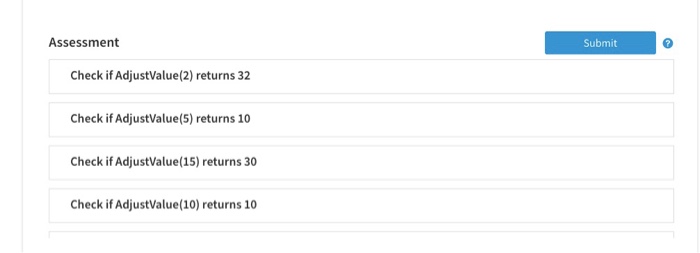 Write a while loop that multiplies userValue by 2 while all of the following conditions are true. Write a while loop that multiplies userValue by 2 while all of the following conditions are true userValue is not 10 userValue is less than 25 Function Save с 1 function userValue AdjustValue userValue 2 3 4 Write a while loop that multiplies userValue by 2 while userValue is not 10 and while userValue is less than 25. This problem has been solved.